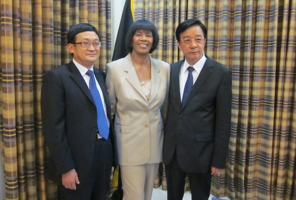 牙買加總理辛普森女士與中國駐牙買加大使鄭清典(左)、英超直播在线e万博總經理湯建國(右)合影