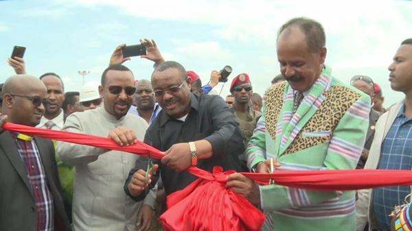 Ethiopian Prime Minister Abiy Ahmed(the second one on the left), Eritrean president Isaisa Afeworki (the second one on the right), and former prime minister of Ethiopia, Haile Mariam (the one in the middle) cut the ribbon at the ceremony
